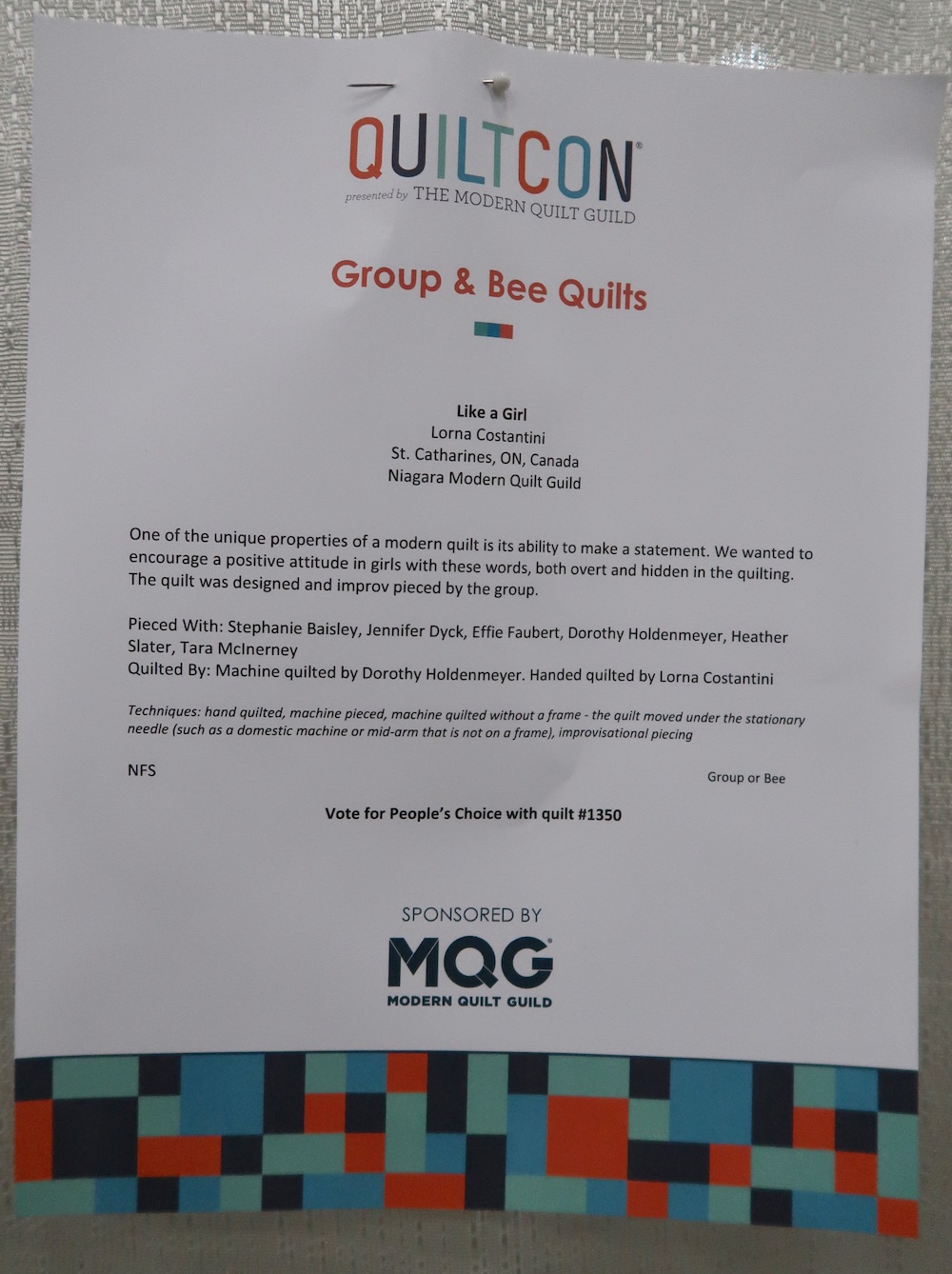 Like a Girl by Lorna Costantini of the Niagara Modern Quilt Guild and others won Judge's Choice, Group & Bee Quilts, sponsored by Modern Quilt Guild, at QuiltCon 2020.