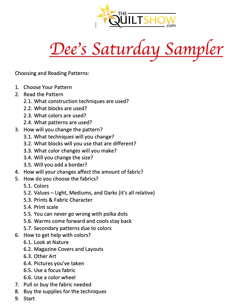 Dee will be teaching in her classroom called "Dee's Saturday Sampler" on TheQuiltshow.com blog, the TQS Facebook, Alex Anderson's Facebook, Ricky Tims' Facebook and the TQS YouTube channel.