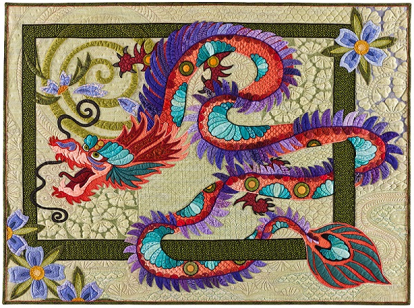 Artist Statement“A collaboration with tattoo artist Stephanie Noell Davis yielded a wonderful image of a Chinese dragon containing my favorite quilt motifs: feathers, spirals, and dots. I adapted her line drawing, adding lots of color. The interior border, sashiko stitching, and quilting designs are all from traditional Japanese stitchery.” (Design inspired by a drawing by Davis)