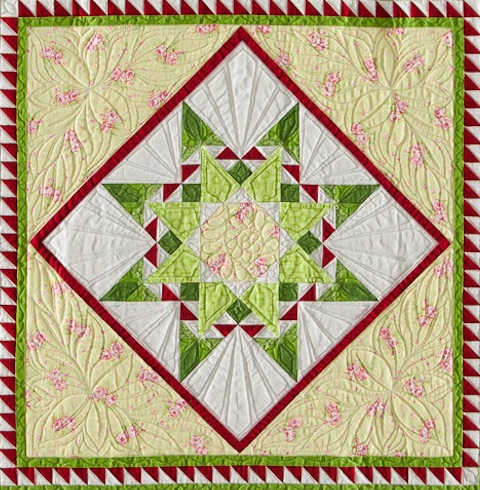 The center block of this quilt incorporates one of Sue's favorite blocks – what Sue calls a Halo Star block. It is a variation of a feathered star block, but she turned some of the feathers (triangle pieces) around, which gives an entirely different look to the traditional feathered star block. It took some finagling around to figure out how to make this block without having any set-in triangles. Instead, by “deconstructing” the block into some basic units, you can easily make this block using paper piecing.