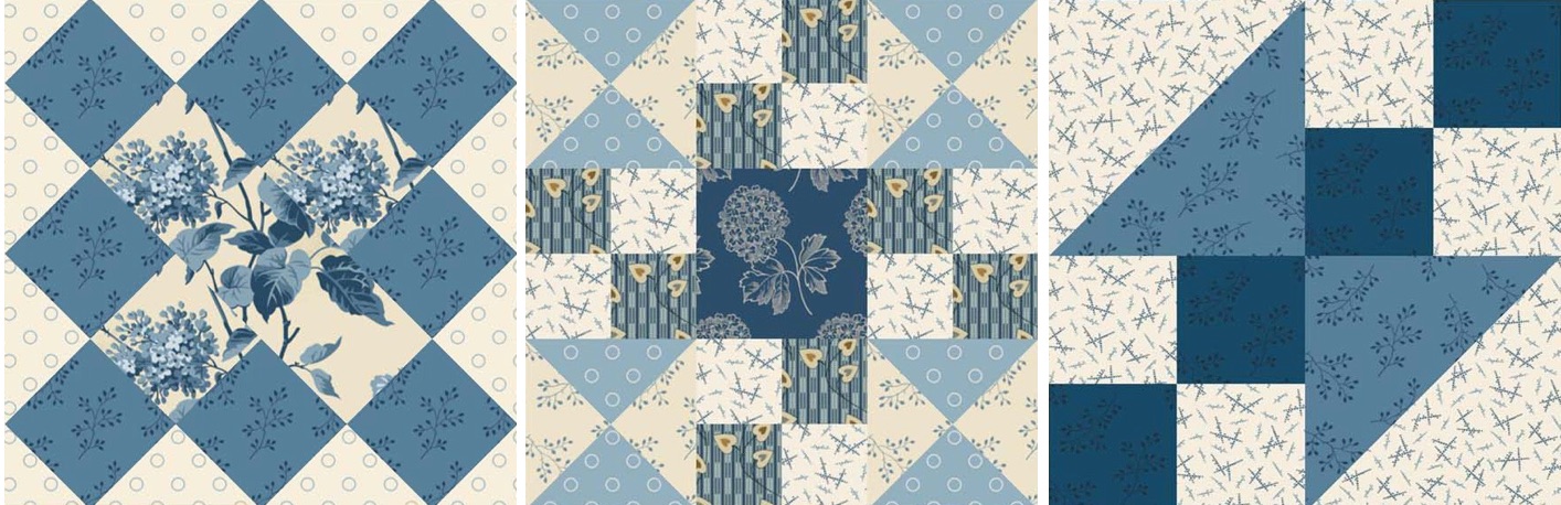 Four-patches abound in these three latest blocks. As before, each block will be made three times for a total of nine blocks.