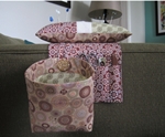 Description: This sturdy pincushion has plenty of space to store pins and needles. The hanging pocket with dividers allows those easily misplaced items to find a home, and the detachable scrap bag help keep stray clippings and threads from littering your workspace. The weighted pincushion can easily perch on the edge of a table or the arm of a chair or sofa.