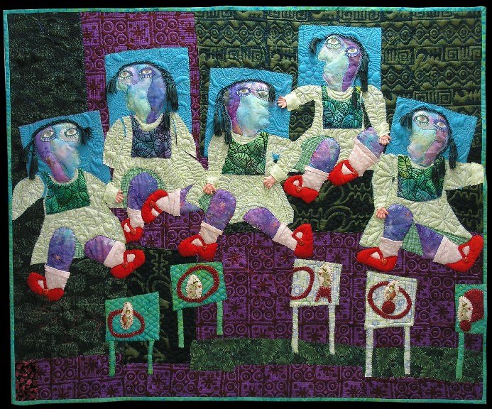 pamincan Dionnes in Quintland - I have depicted the sisters at the beginning of their "career" as world class celebrities. Toddlers, who mercifully perhaps, were not yet aware of their plight. The little tables hold imagery of the three ring circus their lives will become. The quilting too depicts circus performers .