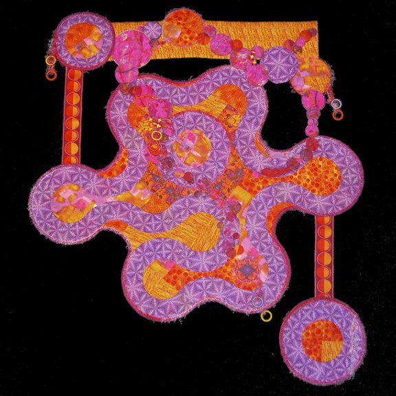 Sewinspired369 Time Travel - This was another art quilt variation of my Winding Curve Quilt Design from my Sew Inspired 3-6-9 Design System. I had more fun making this quilt. Who ever said quilts have to have 4 sides. This was a combination of piecing my Winding Curve blocks with appliqued circles some of which were embellished with my needle felting machine. All the fabrics used in this quilt were commercial fabrics that I designed for Blank Quilting of NY. The fabric line is called Reflexions by Sara Moe.