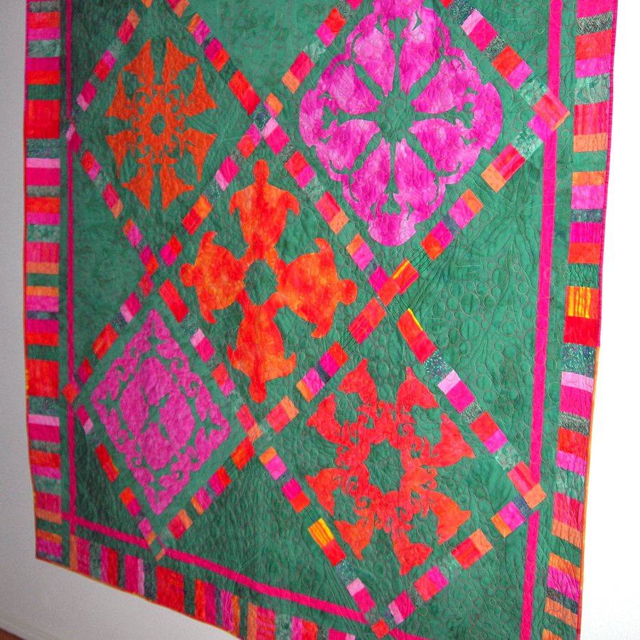 blueearth Healing Heart - I started this because I needed some hand work while on a 3 month overseas vacation. I finished it sitting by my mother's bedside while she was recovering from open heart surgery. UPDATE: Ironically, this quilt will be featured on June 15th which is my mother's 90th birthday and once again I am sitting by her hospital bedside (10 years later) as she is losing her battle with heart disease.