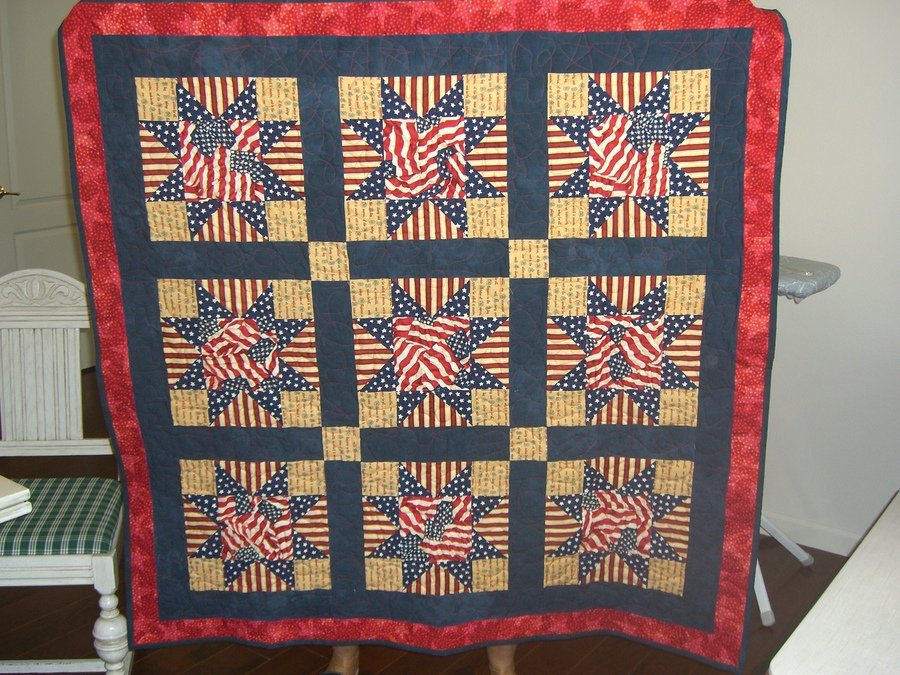 jcarkeet Patriotic Picnic Quilt - I made this quilt to go with a picnic basket and supplies for a summer fundraiser at church. I like the Sawtooth or Lone Star block, so I pieced the squares and then played around with sashing and such until I found something that suited. It was my first time quilting with a long arm machine. When it was finished, I loved it so much I couldn't part with it, so I made my husband buy it back at the auction.