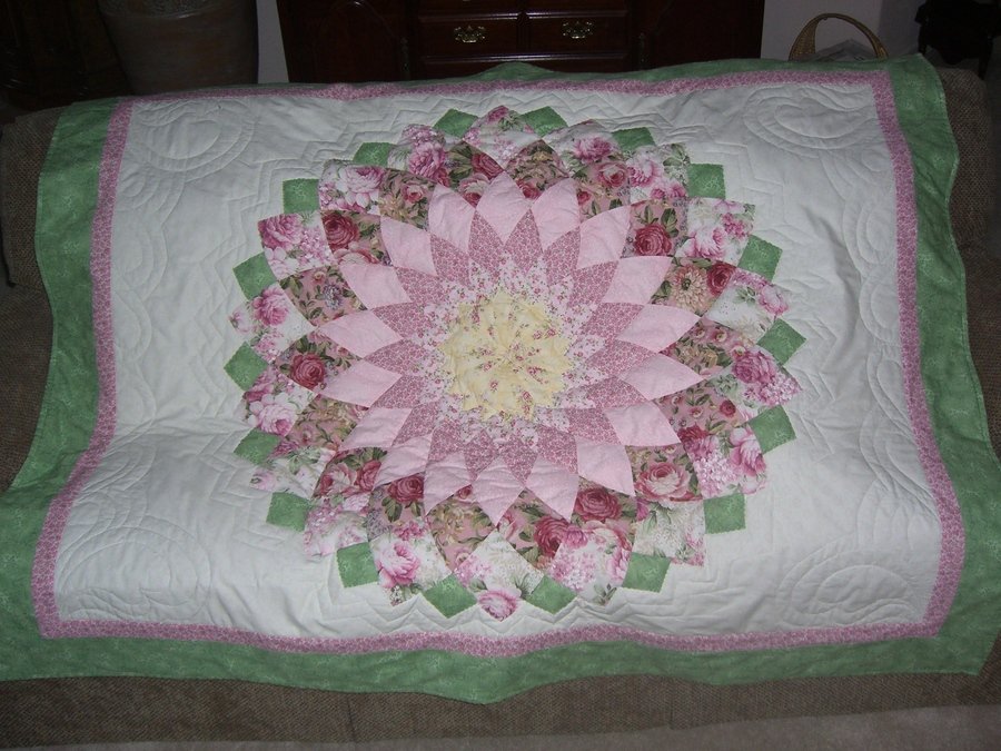 jcarkeet Madeline's Dahlia - I found this dahlia block pattern on the internet, although it's also in EQ6. I modified it a little and made this quilt for my granddaughter for Christmas. It's a traditional dahlia in the center of a cream background with two borders that repeat a couple of fabrics in the flower. It was my first attempt to quilt on my home machine, and it could have been better done on a commercial long arm machine. However, that's how we learn, so I'm happy with the end results.