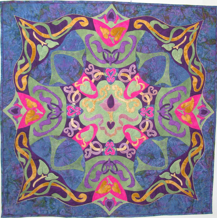 | Design Source - Description | Rhapsody inspired by Art Nouveau designs and color palette of Moorcroft pottery. Skeleton, construction, and embellishments are per Ricky's insturctions but many appliques are not mirrored. |