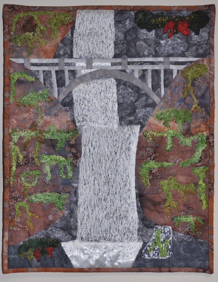 drblt Multnomah Falls - Multnomah Falls is one of the iconic images of Oregon. Until I learned how to make machine lace I was at a loss as to how to capture the falls. I also used machine lace to depict the lush greenery of the western side of Oregon.