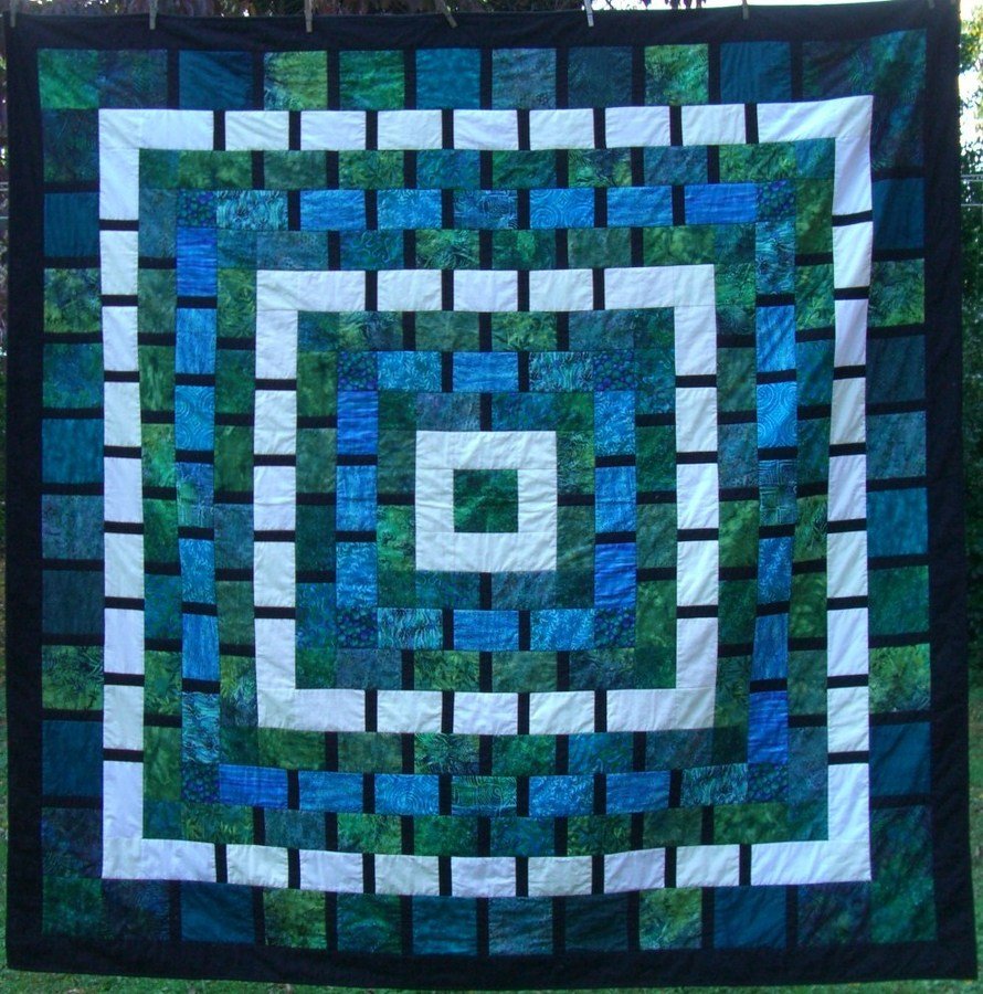 janejohn Touchdown - I was inspired to make this quilt “Touchdown” when I saw pictures of Quilting in the Country’s Quilt Airing event. The quilt was designed by Jane Quinn and the pattern is called The Painted Lady. I used glow in the dark fabric for the center white rectangles border and continued to alternate the glow in the dark white fabric with solid white fabric in the surrounding white borders creating a glow of white dashes when the lights are turned out.