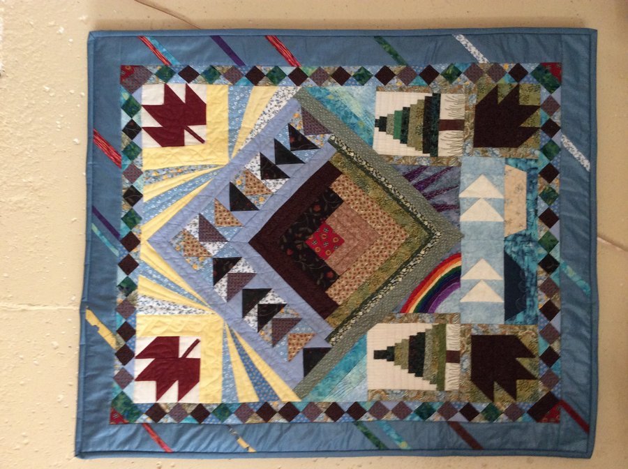 Vivien28 Log cabin in the Islands - I designed this folk art style wall quilt because I love living in the 1000 islands, St Lawrence River area of Ontario. I tried to incorporate maple leaves for Canada, flying geese, the log cabin, pine trees, sailboats, bear paws, rainbow, lighting and sun and clouds, to celebrate all the seasons that we enjoy. The little squares on point represent the islands