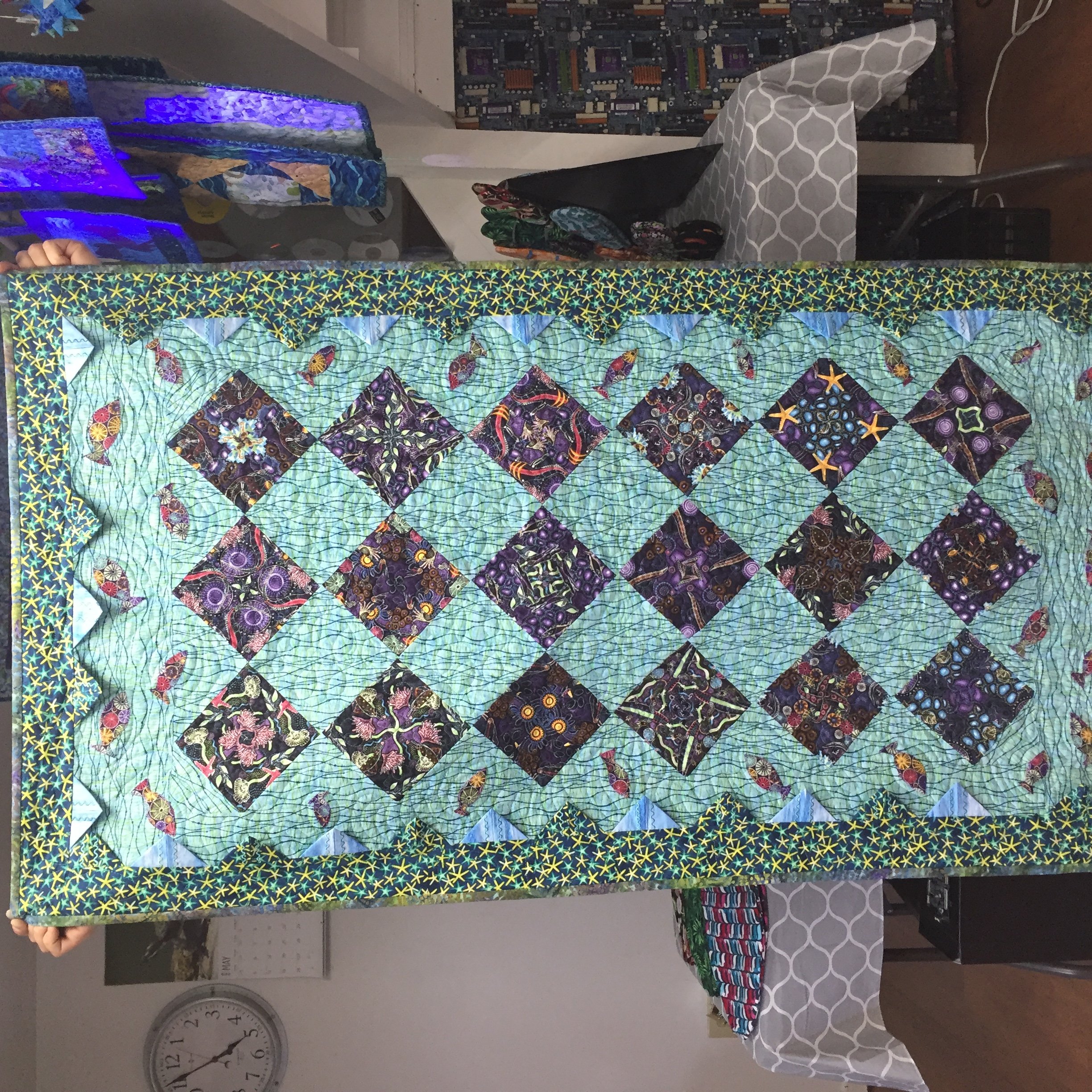 This fun fishie quilt is a combination of TQS techniques. First, I used Paula Doyle's method of easy stack to make the fabulous blocks then had to cut out the fishie appliques. Second, I used Susan Clevland's Prairie Pointer tool and techniques for the embroidered prairie points. When I free-motion quilted,I used Lori Kennedy's continuous fish design all over and I echoed the fishie appliques. The back is coral reef fabric so under this quilt you are definitely under the sea!