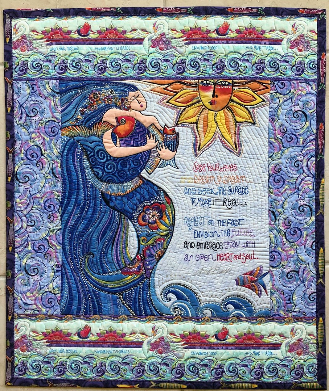 This wall hanging is for my niece who is a scuba diver, her choice for transformation into a mystical mermaid. In case it doesn't show up well in the photo, the quilting on the mermaid, her hair, the swans and in the section where the words are is all done in metallic glitter thread. It was a challenge to sew it without breakage, but I'm very happy with the impact in free motion quilting.