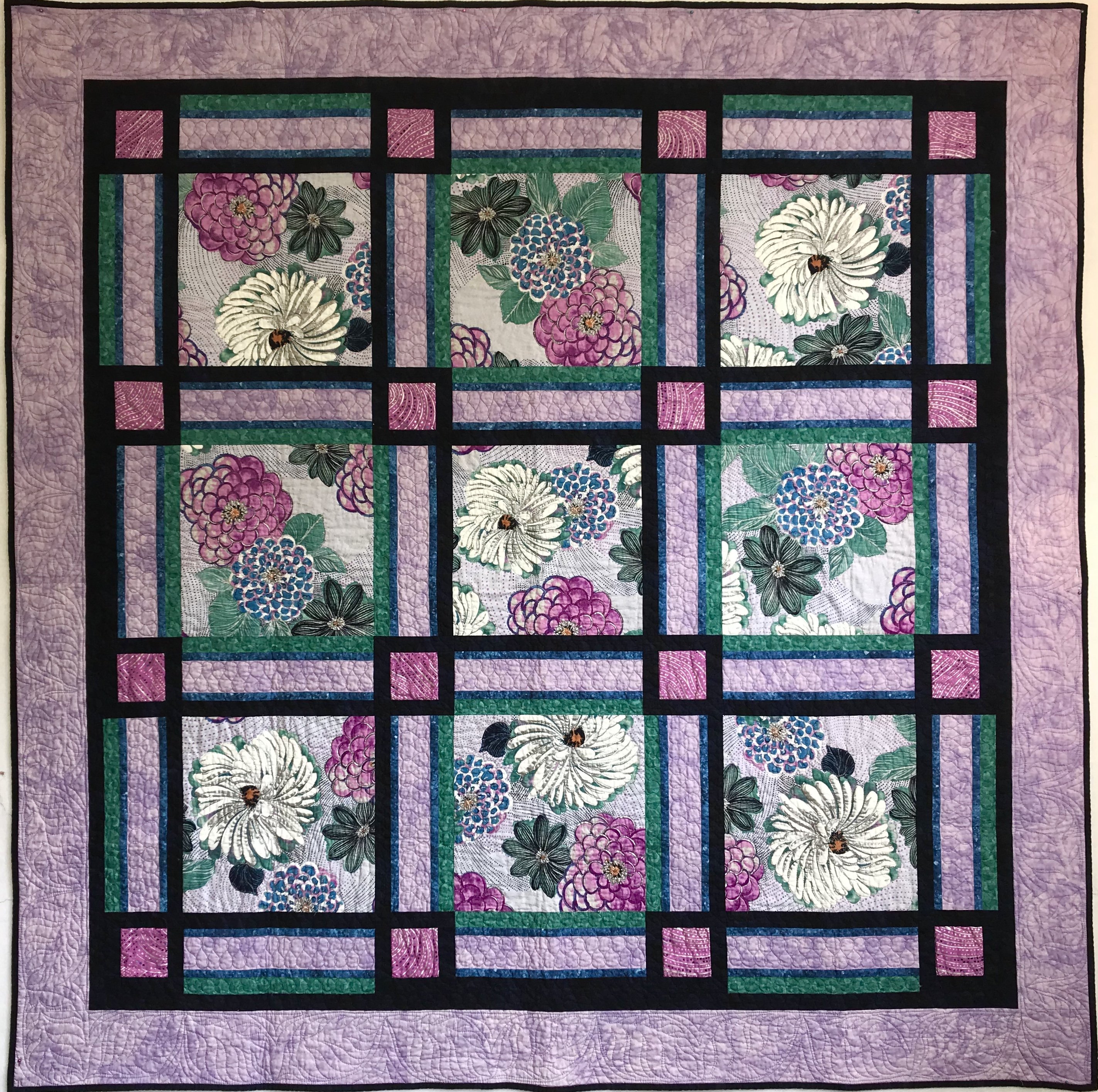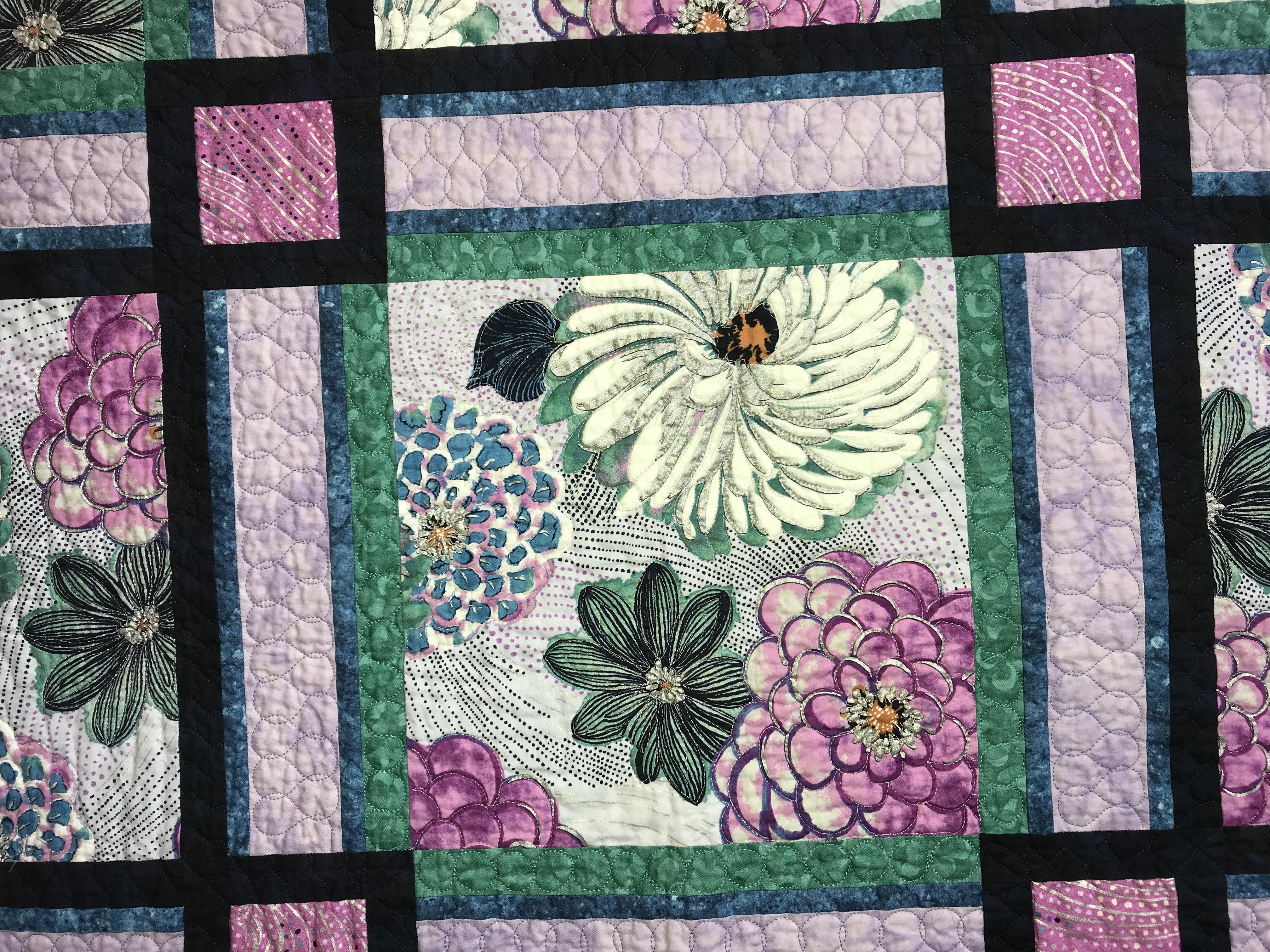 fell in love with this wonderful large floral print and needed good pattern to feature the large flowers. The pattern is April in Paris. It was a free pattern from eQuilter and Lorene Smith. I had fun with my fairly new HQ Sweet Sixteen trying out new quilting motifs in the sashing and borders.