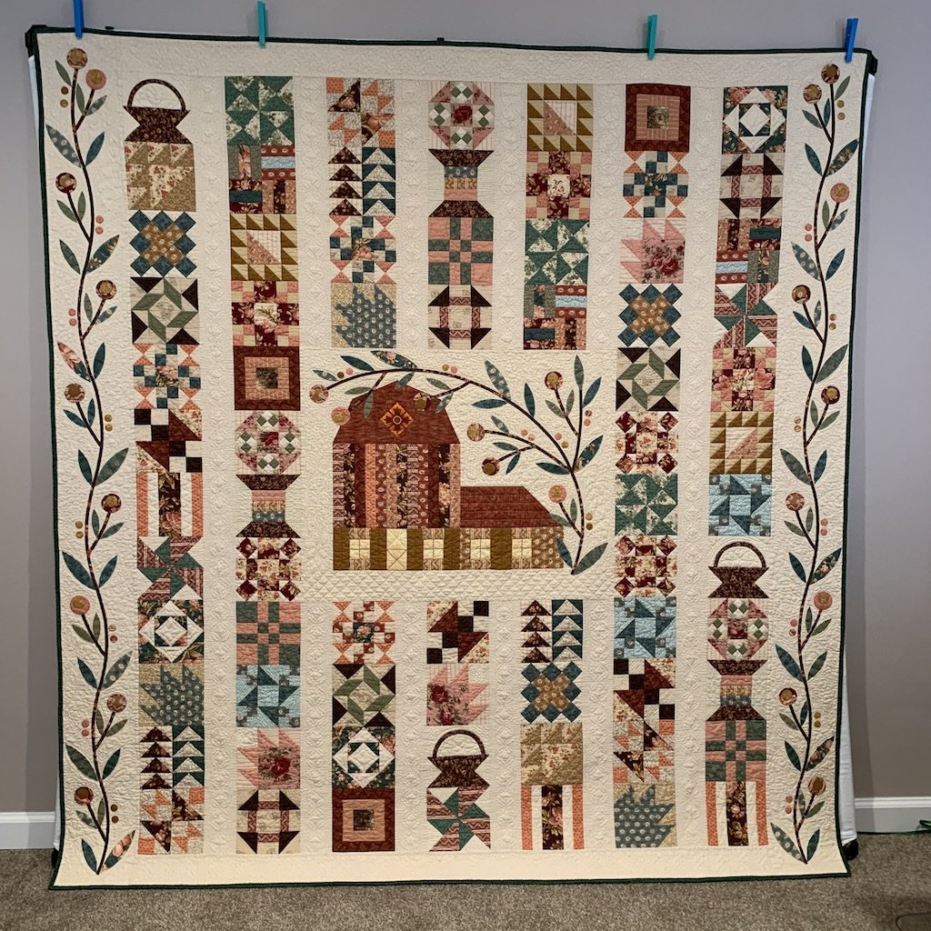 I was really drawn to the colors of this quit so I purchased the kit and incorporated some of my fabrics. The barn block was added by me and was fussy cut from fabric that I had in my stash. I used Deb Tucker's, Studio 180 Designs, Square Squared ruler for the square in a square block which worked very well. The quilting was done using free motion quilting techniques and with Cindy Needham's stencils. Thank you TQS for so many wondereful learning opportunities and inspiration.