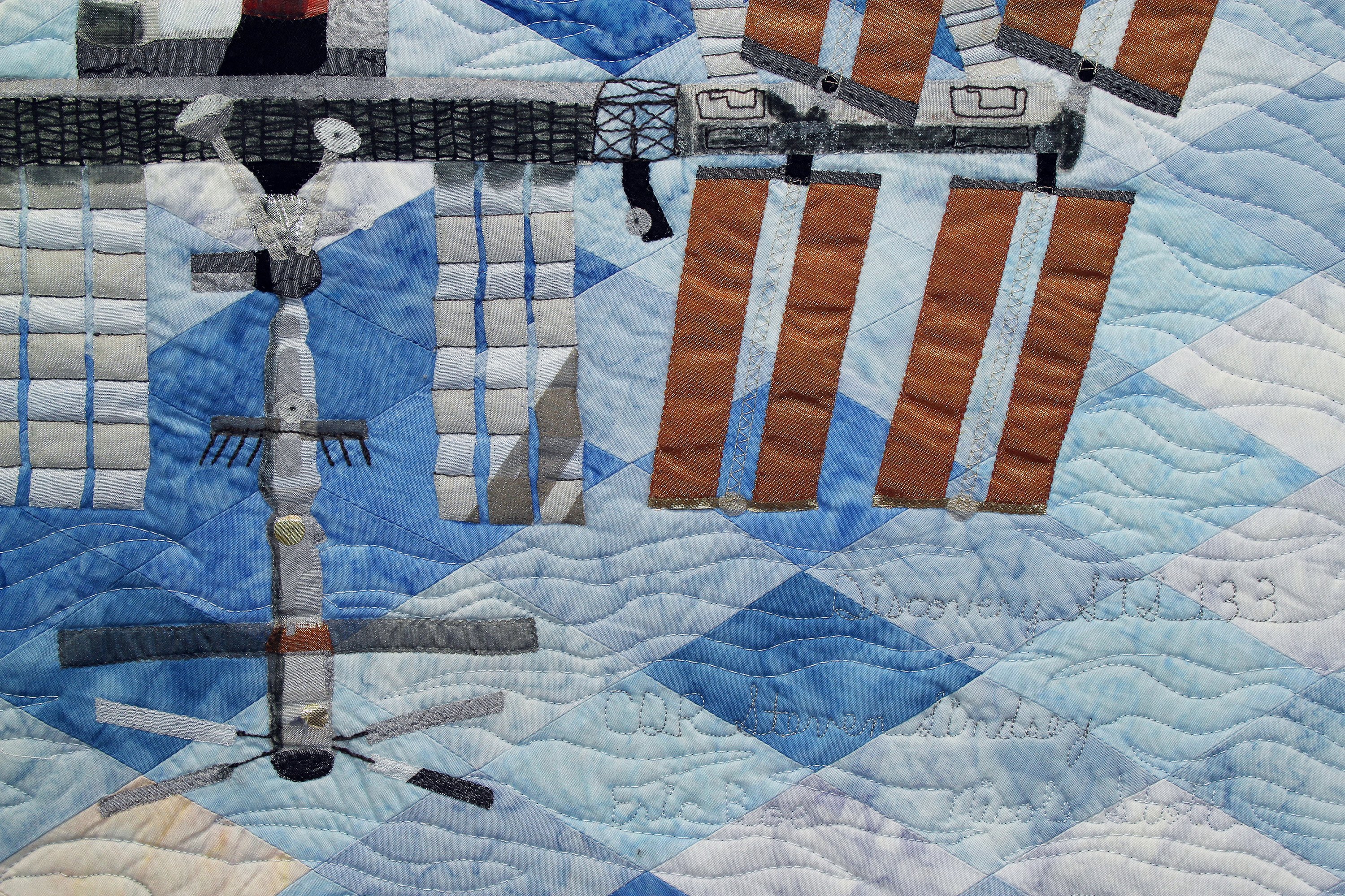 My quilt is based on a photo taken from Space Shuttle Discovery after Discovery undocked from ISS. On this its final space voyage, Discovery provided a transportation bridge between Earth and ISS.
